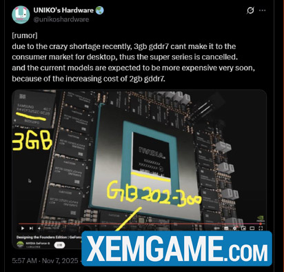 Tuy nhiên, theo bài đăng từ ‘Uniko’s Hardware’, một chuyên gia rò rỉ thông tin công nghệ trên X (trước đây là Twitter), những con chip 3Gb này đang phải chịu tình trạng “thiếu hụt nghiêm trọng”, nghĩa là chúng sẽ không có đủ số lượng cho card đồ họa máy tính để bàn và “do đó, dòng sản phẩm siêu cấp này sẽ bị hủy bỏ”.