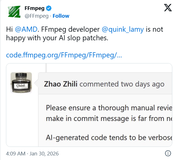 Vấn đề càng trở nên nghiêm trọng hơn khi một thành viên của nhóm FFmpeg có quyền truy cập vào tài khoản X của họ đã chụp ảnh màn hình bình luận này và đăng tải: “Chào @AMD. Nhà phát triển FFmpeg @quink_lamy không hài lòng với các bản vá lỗi AI cẩu thả của các bạn.”