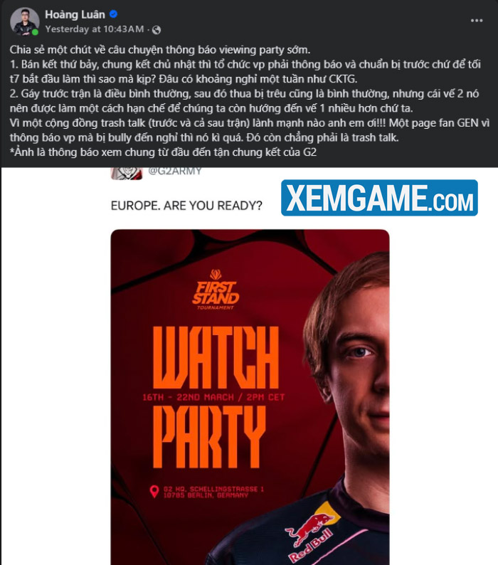 Cụ thể, anh cho rằng việc trêu và gáy sau trận nên có chừng mực, còn về việc fanpage kia thông báo Viewing Party quá sớm cũng không hẳn là đáng trách khi họ phải chốt địa điểm, công tác tổ chức. Đến chính là G2 cũng có động thái tương tự để dự phòng, mà giờ chỉ vì bị trêu trên mạng quá nhiều mà fanpage nọ phải dừng không tổ chức sự kiện cộng đồng nữa nữa thì thật đáng tiếc.