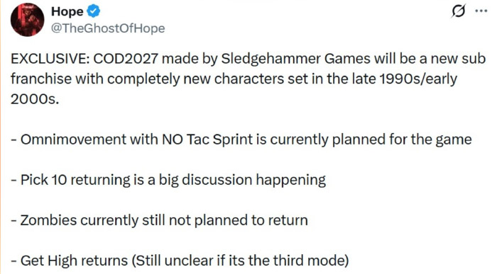 Người này tuyên bố rằng Sledgehammer Games sẽ tiếp quản với một “một thương hiệu phụ mới”, điều này phù hợp với thông báo gần đây của Activision về việc ngừng phát hành liên tiếp hai series game như họ đã làm với Modern Warfare 2 và 3, rồi Black Ops 6 và 7. Tuy nhiên, một số tiết lộ khác của người rò rỉ lại gây bất ngờ hơn nhiều.