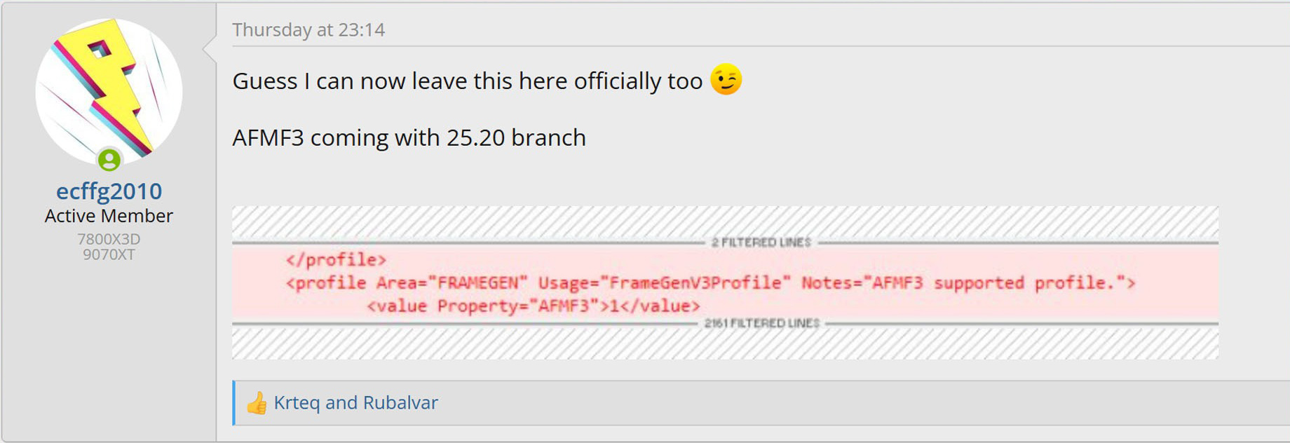 Phiên bản mới tiềm năng của Fluid Motion Frames đã được phát hiện bởi người dùng diễn đàn Guru3D ecffg2919, người đã phát hiện ra một số mã tham chiếu đến công nghệ mới trong nhánh 25.20 của trình điều khiển Adrenalin, được hiển thị trong ảnh chụp màn hình ở trên. Dòng này ghi rõ “AFMF3” hai lần trong phần dành riêng cho công nghệ tạo khung hình, và chúng ta chỉ có thể giả định rằng đây là viết tắt của AMD Fluid Motion Frames 3.