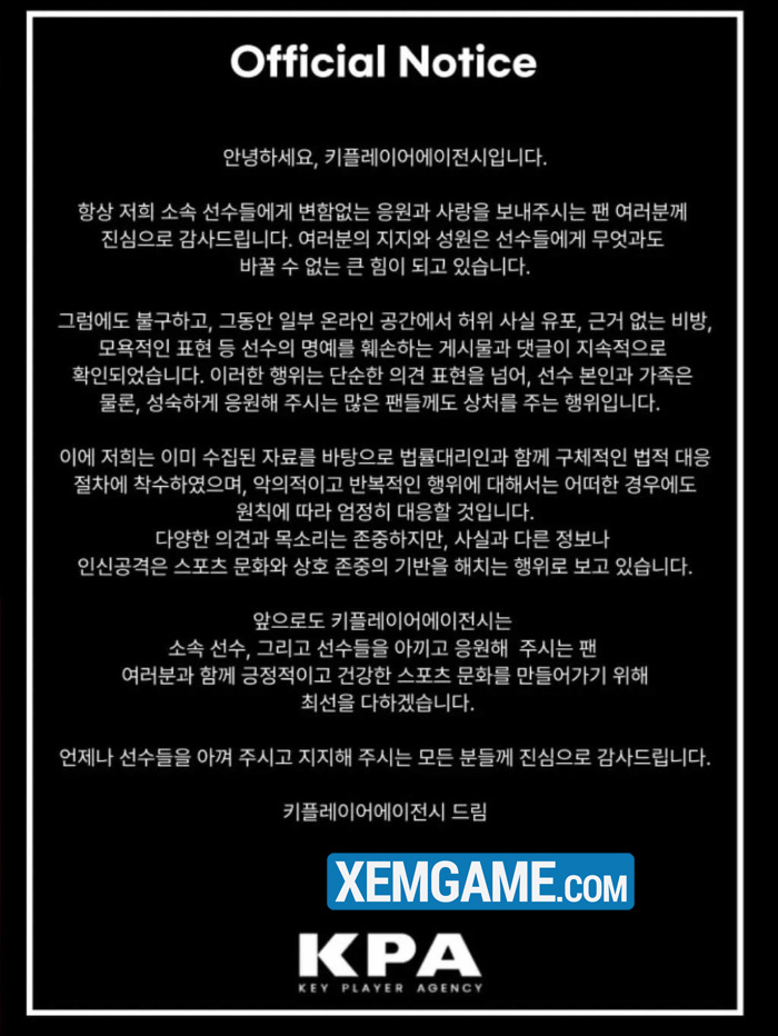 Sau đó Key Player Agency (đại diện của T1 Oner) thông báo đang tiến hành các thủ tục pháp lý để khởi kiện những cá nhân có hành vi bôi nhọ, xúc phạm và lan truyền tin đồn sai sự thật về Oner. Đơn vị này cũng khẳng định sẽ xử lý nghiêm khắc, không khoan nhượng đối với các hành vi ác ý nhằm bảo vệ Oner, gia đình anh và cả những người ủng hộ văn minh.