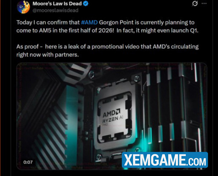 Tin đồn mới nhất về các phiên bản máy tính để bàn của dòng Ryzen AI 400 cho biết chúng sẽ chính thức ra mắt “trong nửa đầu năm 2026”, theo một thông tin rò rỉ mới từ nguồn tin công nghệ thường xuyên Moore’s Law is Dead (MLID). Đăng tải trên X, MLID cho biết: “Có thể xác nhận rằng #AMD Gorgon Point hiện đang lên kế hoạch ra mắt trên nền tảng AM5 trong nửa đầu năm 2026! Trên thực tế, nó thậm chí có thể ra mắt vào quý 1.”