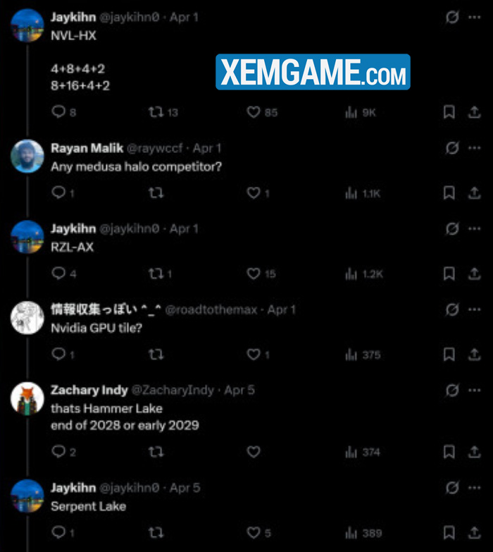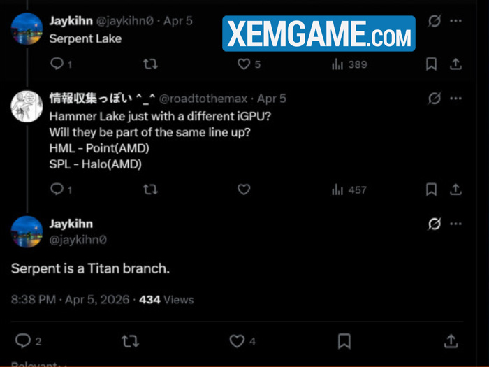 Tên gọi Serpent Lake và sự liên hệ của nó với việc đây là CPU Intel x Nvidia đầu tiên được ra mắt xuất phát từ một nguồn rò rỉ công nghệ quen thuộc, @jaykihn0, trên diễn đàn X. Trong một chuỗi bài đăng trên nền tảng mạng xã hội kéo dài nhiều ngày, nhiều người dùng đã thảo luận chi tiết về các CPU Intel sắp ra mắt, bao gồm các thiết kế Nova Lake, Razer Lake và Hammer Lake, với một người dùng hỏi liệu Razer Lake có tích hợp “GPU Nvidia” hay không. Đáp lại, một người dùng khác cho rằng điều này sẽ xuất hiện cùng với Hammer Lake, nhưng sau đó Jaykihn chỉ trả lời đơn giản là “Serpent Lake”, dường như để đính chính câu trả lời đầu tiên.