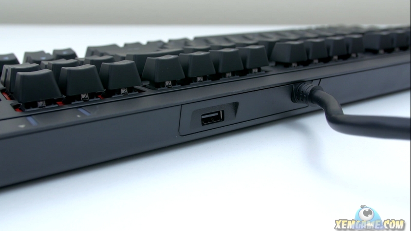Theo đó, 1 đầu sẽ cấp điện và truyền dữ liệu cho Corsair Strafe, còn 1 đầu sẽ có nhiệm vụ mở rộng cổng USB máy tính lên bàn phím. Bởi đằng trước Strafe, chính là 1 cổng USB phụ để bạn thoải mái cắm chuột, tai nghe, USB… tùy theo sở thích của bạn.