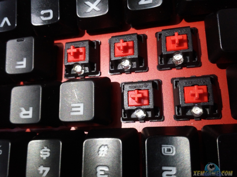 Về hệ thống nút Switch lẫn đèn Led của Strafe, mình cũng không có quá nhiều ấn tượng, như đã nói, Switch Red đến từ Cherry – nhà sản xuất Switch top 1 thế giới – kèm với hệ thống đèn Led 1 màu đỏ. Ánh sáng sử dụng cho buổi tối vừa đủ, không quá chói cũng không quá tối, bạn có thể điều chỉnh độ sáng trực tiếp trên bàn phím hoặc bằng phần mềm trên máy tính. Cũng nên lưu ý, Strafe có thể được cài đặt các kiểu đèn Led khác nhau từ phần mềm đó để tạo nên một phong cách riêng cho mỗi game thủ.