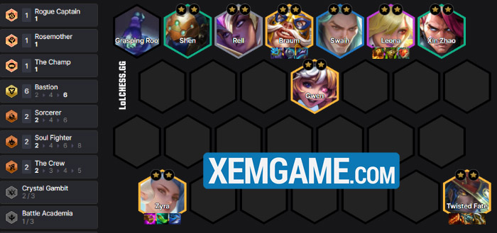 Ở 9 chúng ta spam hết tiền để tìm tướng 5 vàng Twisted Fate, Zyra, Braum cùng +1 tướng khỏe bất kỳ (Gwen là lựa chọn đẹp vì có Pháp Sư và Tinh Võ Sư) :