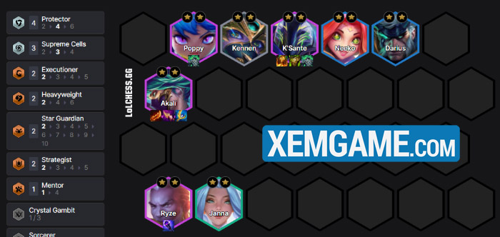Mục tiêu của bài này vẫn là fast 8 để đánh Akali, tuy vậy khi roll ở 8 chúng ta sẽ có thêm một vị tướng 4 vàng khác ghép vào là Poppy. Đồng thời thì trong chiến thuật này chúng ta cũng không xây dựng 6 Hộ Vệ mà thay vào đó thêm Darius và Kai’sa để thêm hiệu ứng Hội Tối Thượng cho Akali.