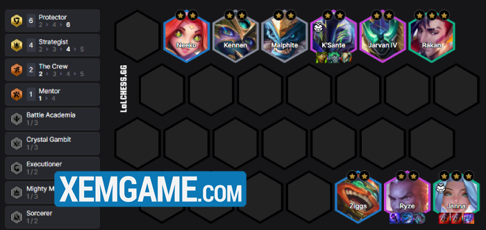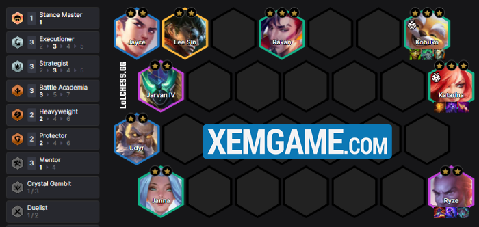 Trong bài Katarina Cựu Binh này, chúng ta sẽ ưu tiên reroll Katarina và Kobuko/Rakan, ở các cấp 7 đến 8 thì Janna và Jarvan sẽ điền vào chỗ trống cho các vị trí của Hộ Vệ và Quân Sư đi kèm. Ở các cấp cuối cùng thì Lee Sin Thế Đao Phủ sẽ là mảnh ghép cuối cùng.