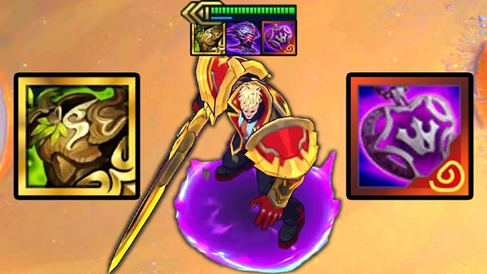 Garen sẽ càng hồi máu và năng lượng vượt trội cùng trang bị Tạo Tác Dây Chuyền Tự Lực để biến thành một con siêu tượng :