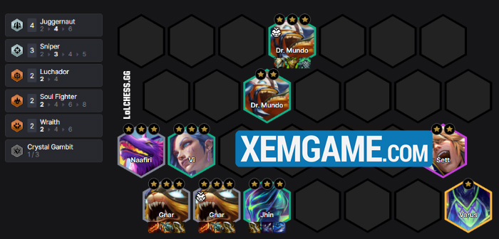 Về trang bị thì Gnar chính của chúng ta sẽ cầm Vô Cực, Cuồng Đao, Móc Diệt trong khi Mundo là Thú Tượng, Giáp Máu, Giáp Tâm Linh. Jhin và Vi sẽ cầm những món đồ STVL/tank dôi ra.