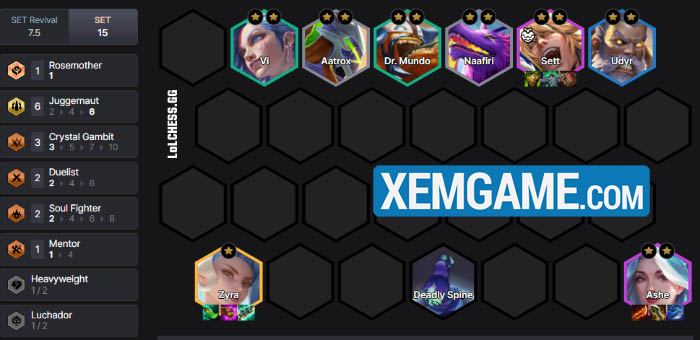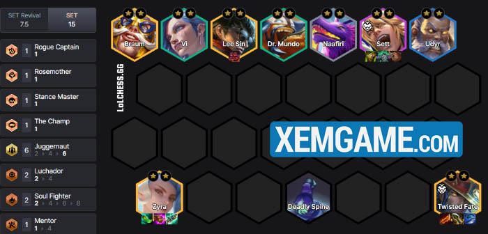 Về trang bị thì Twisted Fate có thể dùng tốt cả 2 bộ trang bị của AD/AP nên bạn có thể tùy biến, còn Zyra thì những món dư ra. Sett và Lee Sin ở trên sẽ cầm các món còn lại.