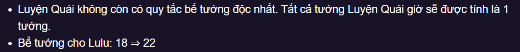 Một trong những thứ khiến game thủ cảm thấy khó chịu nhất ở 15.5 chính là việc cơ chế lằng nhằng của Luyện Quái bị lạm dụng. Do không còn cấp độ riêng biệt của từng vị tướng trong Luyện Quái nữa, dẫn đến việc có gần như 50 phiên bản Lulu trong cửa hàng, nên 1 game mà có thể có đến 3-4 nhà cùng nhau roll tranh Kog’Maw – tướng khỏe nhất của 15.5: