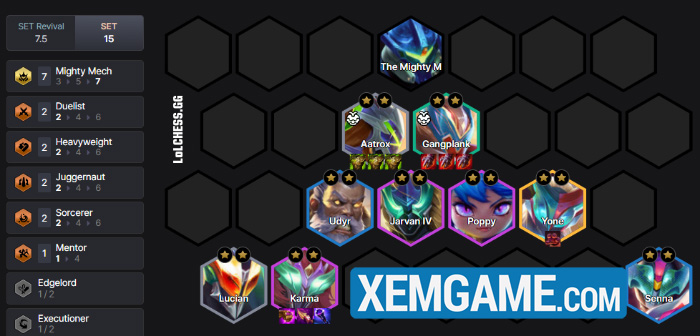 Lúc này với việc Gangplank và Aatrox đã xong bộ đồ chuyển chỉ số cho Cơ Giáp, nhiệm vụ từ cấp 8 và 9 chúng ta sẽ xây dựng đồ carry/bổ trợ cho các tướng còn lại trong lúc tìm 2 Đại Cơ Giáp mạnh là Yone và Karma để đội hình cuối cùng như sau :