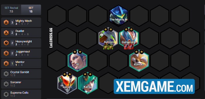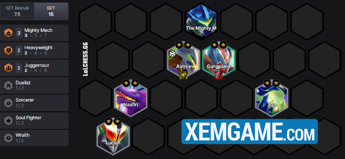 Về cách xây dựng đội hình thì hết sức đơn giản, chúng ta sẽ để các Đại Cơ Giáp vào từ từ theo cấp độ, trong lúc xây dựng các trang bị sẵn cho Gangplank và Aatrox với 3 Móng Vuốt và 3 Giáp Máu. Đây là những trang bị cho nhiều chỉ số cần thiết nhất có thể, và qua đó sẽ mang đến sự sinh tồn nhất định cho Siêu Chiến Giáp.
