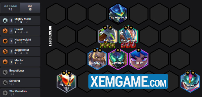 Về cơ bản thì 2 Phi Công mà chúng ta sẽ lựa chọn là Aatrox và Gangplank, lý do là 3 Tộc Dũng Sĩ, Song Đấu và Hạng Nặng đều là những Tộc cho khả năng gây sát thương và chống chịu tốt – và qua đó giúp cho Siêu Chiến Giáp – xếp lên hàng đầu bổ liên tục và lâu dài.