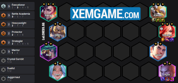 Và cuối cùng, đội hình mà để khắc chế các đội hình nhiều tank, ít carry ở trên thì chúng ta sẽ có Akali quen thuộc. Trong bản 15.6 thì Akali bị giảm chỉ 5 sát thương lướt – không có gì nhiều nhặn lắm ảnh hưởng tỉ lệ thắng của nó, thậm chí về late thì đội hình Đao Phủ còn mạnh hơn với những Ryze và Lee Sin được tăng khá nhiều sát thương.