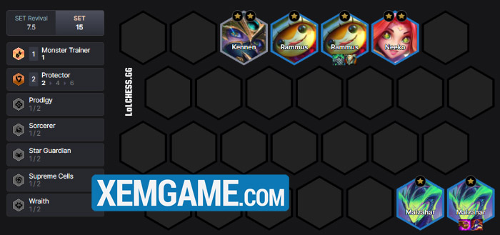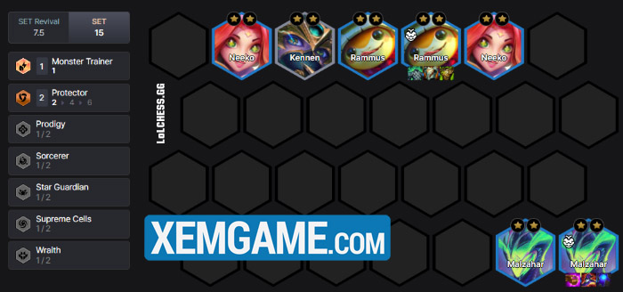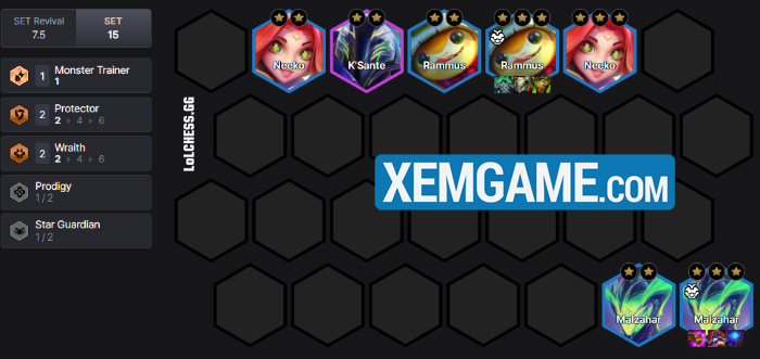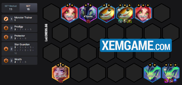 Về trang bị thì Malzahar sẽ là combo Bùa Xanh + Mũ Phù Thủy + Găng Bảo Thạch trong khi đó Rammus ở trên là Thú Tượng + 2 món tank flex. Seraphine và K’Sante/Neeko 3 sao là những món dôi ra.