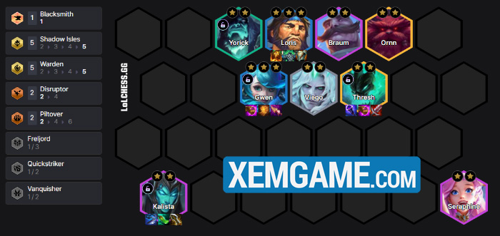 Về trang bị thì Gwen sẽ là các trang bị phép cho chí mạng như Găng Bảo Thạch, Găng Công Lý, Nashor, Loris là 3 món tank flex, Kalista là thuần STVL + Shojin trong khi Thresh cầm các món dư ra. Tùy vào tình trạng đồ đạc có thể cho thêm Seraphine hay Kindred, Fiddlesticks. Ornn cũng có thể bỏ vào tìm đồ Tạo Tác nếu ra sớm, nhưng khá hên xui.