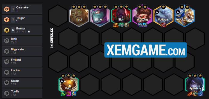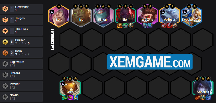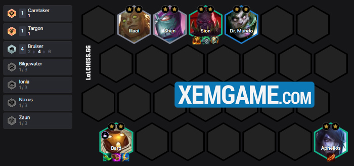 Roll 4 lần để có ngay Bard trước cấp 6, ở 6 thì chúng ta sẽ có ngay bộ Bard + Aphelios + 4 Đấu Sĩ. Aphelios là lựa chọn hợp lý nhất vì đây là tướng solo carry vật lý rất mạnh, bổ sung nguồn sát thương quý giá cho đội hình và còn là tướng 2 vàng – dễ roll cùng lúc với Bard. Mục tiêu của chúng là roll cho đến khi Bard = Aphelios = Sion 3 sao, có Shen và Illaoi cũng 3 sao càng tốt :