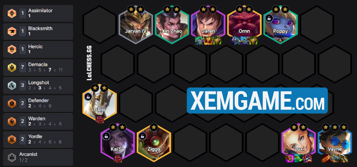 Trong quá trình từ từ lên cấp 9, có thể tháo đồ của tank phụ và đưa cho Poppy 1 round để có thể lấy Ziggs ở 9 và hoàn thành đội hình, thêm Ornn để farm đồ Tạo Tác :