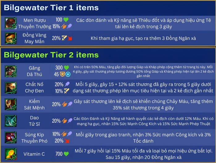 Sau khi có 5 Bilgewater, mặc định mua vật phẩm rẻ nhất cho đến khi xuất hiện làm mới shop/Đồng Vàng May Mắn. Lặp lại quá trình này để kiếm thêm đồ Bilgewater xịn ngoài Đồng Vàng May Mắn.