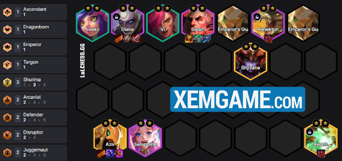 Up lên 9 và tìm cách mua Azir, sau đó tùy vào việc mở khóa được Xerath, Renekton hay Nasus mà sẽ thay vào luôn cho đội hình mạnh nhất có thể, roll các tướng 4-5 vàng lên sao là được :
