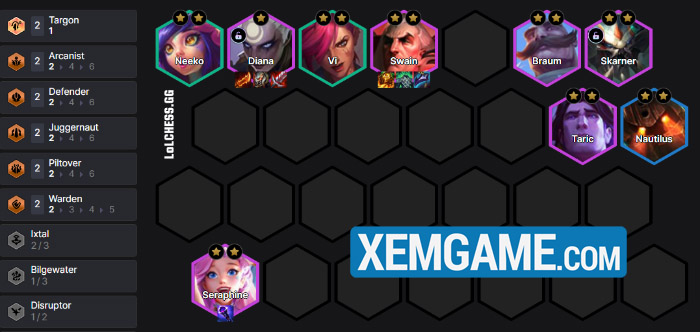 Tiếp tục eco để up lên 8, trong giai đoạn này chúng ta sẽ roll xuống để tìm Diana 2 sao và một số vị tướng giá trị như Braum, Seraphine, Skarner, Taric. Def được kha khá thì eco lại để lên 9 tiếp :