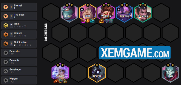Vậy khung đội hình vận dụng Kindred tốt nhất sẽ như thế nào? Chúng ta sẽ cần flex 3 Ionia (với tướng quan trọng nhất là Yunara – kích Cực Tốc), Sett (thêm sát thương hàng đầu) và Ahri (kích Pháp Sư cùng tank quốc dân Swain). Thêm các tướng 5 vàng quen thuộc là Fiddlesticks, Shyvana, Lucian là xong bài :