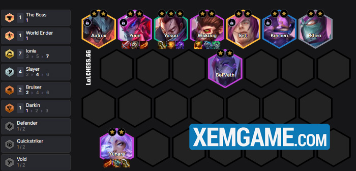 Về trang bị thì Yasuo sẽ cần Vô Cực, Áo Choàng Bóng Tối, Găng Công Lý, Yone sẽ là Cuồng Đao, Huyết Kiếm, Quyền Năng… Wukong là các trang bị tank dư ra, Yunara và Bel’veth, Aatrox là những món còn lại.