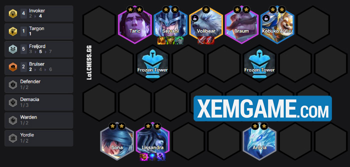 Up lên 8 và roll xuống tìm bộ đôi 4 vàng của Freljord, đồng thời chúng ta sẽ có Volibear luôn. Do nãy giờ chúng ta đã có được 6 cấp sao độc nhất của Yordle, Thuật Sư hay Đấu Sĩ (có thể dùng form Đấu Sĩ def vài round). Chúng ta sẽ có đội hình như sau :