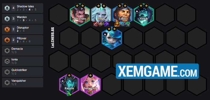 Up lên 6 và 7 thì chúng ta cứ tiếp tục bỏ Gwen -> Kalista -> Thresh vào :