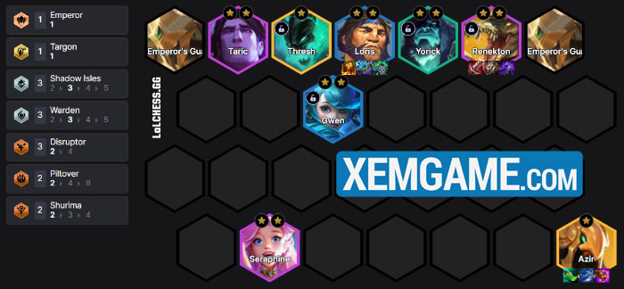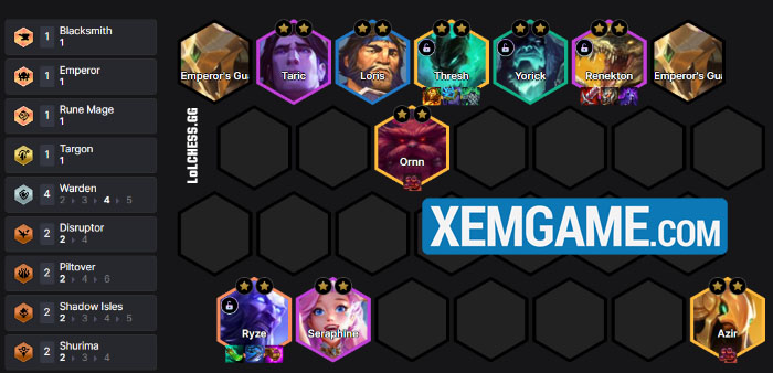 Về trang bị thì chúng ta tập trung đồ đấu sĩ Viego => Renekton, tank thì có thể từ Loris => Ornn/Thresh hoặc cho Thresh đồ AP. Cuối cùng là đồ tốc đánh/AP/năng lượng cho Gwen => Seraphine => Azir = Ryze.