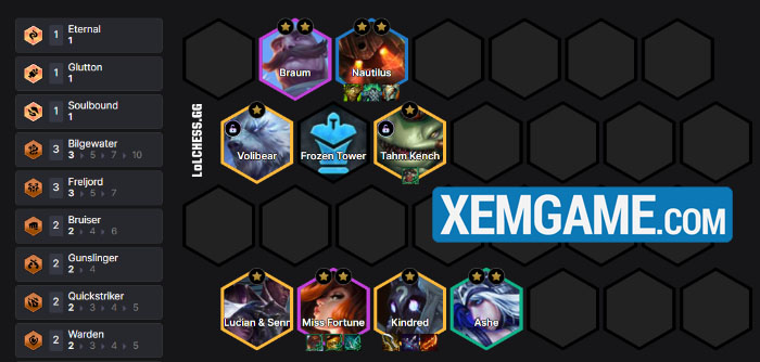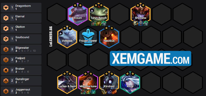Up lên 8, lúc này chúng ta sẽ mở khóa được Gấu Volibear và Tahm Kench, roll các tướng 4 vàng như Miss Fortune và có thể ra một số 5 vàng như Lucian/Senna, Braum. Lúc này không cần Ngân Xà nữa thì có thể bỏ bớt Bilgewater ra :