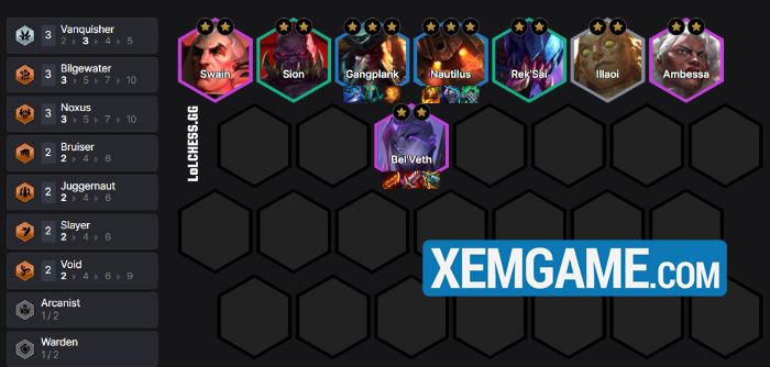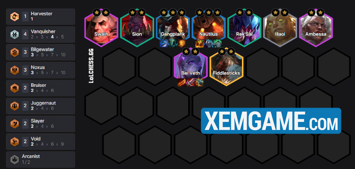 Cấp 8 để hoàn thành bài đấu với việc reroll cả Gangplank và Nautilus lên 3 sao (từ Chợ Đen và reroll thường), bổ sung Ambessa và Swain để hoàn thành khung