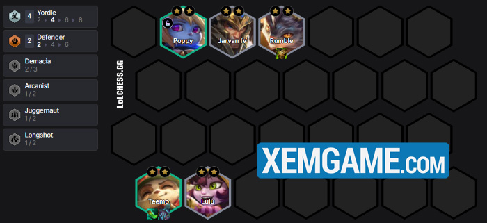Cấp 5 thì chúng ta sẽ dồn đồ cho Teemo/Rumble phía trên (2 món) để mở khóa Poppy và có khung 4 Yordle sớm :