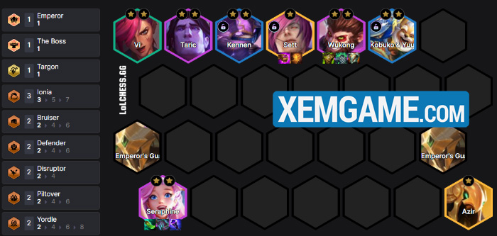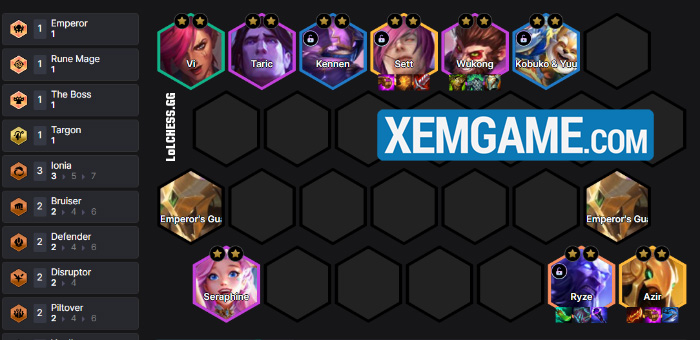 Up lên 8, chúng ta nên roll vài lượt để tìm cơ hội ra các tướng 4/5 vàng. Những vị tướng chúng ta luôn giữ lại là Azir, Seraphine, Wukong, Taric, Vi tìm cách mở khóa Sett :