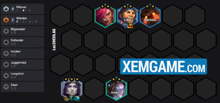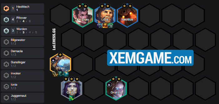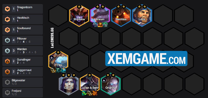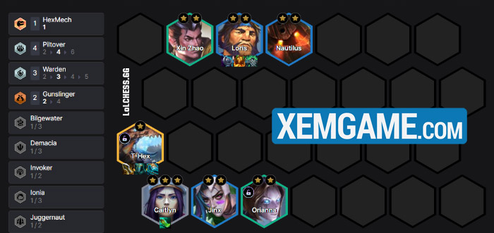 Lưu ý là không chỉ Caitlyn 3 sao, ở cấp độ 5 thì cần Orianna 2 sao, Vi 2 sao và Nautilus 2 sao, Loris 2 sao để có thể mở khóa được T-Hex. Đội hình này chỉ có thể được sử dụng để tăng sức mạnh cho T-Hex nếu chất lượng của các đơn vị Piltover cao, và chỉ khi chất lượng của các thành viên phối hợp cao thì nó mới có thể tạo thành chuỗi thắng trở lại và có tiền hướng đến cấp độ 9.