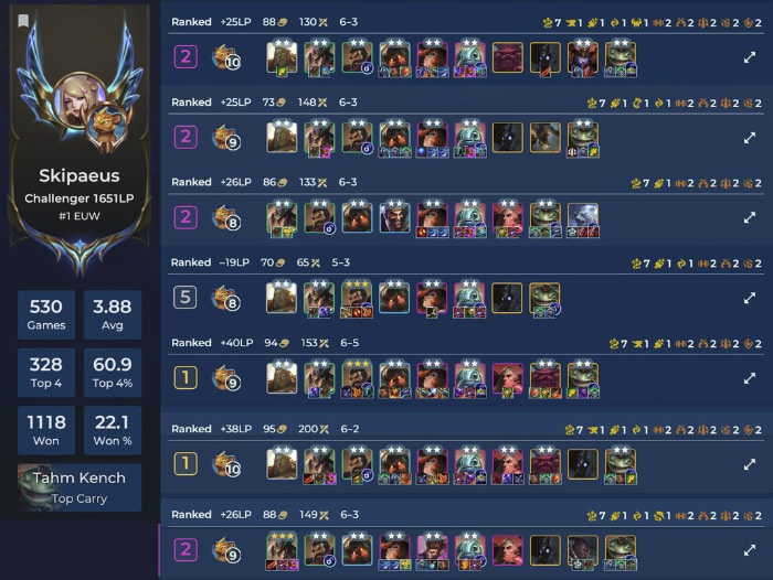 Với sự thay đổi của lối lên cáctrang bị chủ chốt trong giai đoạn nửa sau của phiên bản đầu tiên, Graves reroll đã trở thành một trong rất nhiều bài đấu đã trở nên mạnh một cách bất thường. Bài này đang được các game thủ Thách Đấu EU sử dụng để lên top 1 bảng xếp hạng, nên sức mạnh đã được chứng minh để giúp người chơi có đội hình mới để spam trong giai đoạn này.