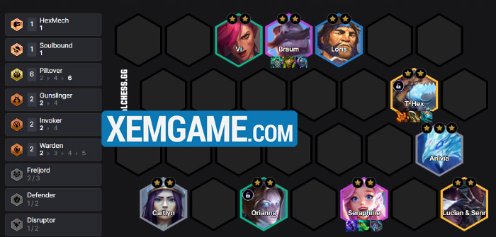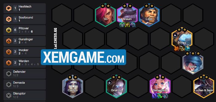 Theo đó, Sona/Anivia 3 sao sẽ vào buồng thay thế cho Caitlyn – và vẫn cho một lượng hồi phục năng lượng lớn trong khi chúng còn kích luôn cả Thuật Sĩ, giúp Khủng Long khè sớm hơn nữa. Tuy rằng bạn vẫn phải may mắn trong việc roll được Seraphine khi lên cấp 8 (để đủ 9 cấp tướng Piltover) nhưng chúng ta có nền tảng cấp độ đỡ hơn một xíu so với việc chết cứng ở 5 để roll 1 vàng 3 sao.
