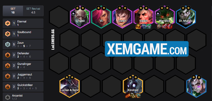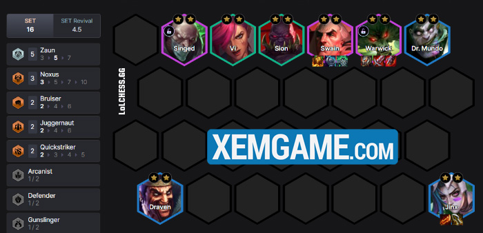 Sau khi có Warwick mở được Singed, chúng ta sẽ bắt đầu bỏ bớt các Zaun không cần thiết và thay bằng một số vị tướng mạnh như Swain – Sion – Mundo ở 8, roll Warwick 2 sao để giữ máu đánh late :