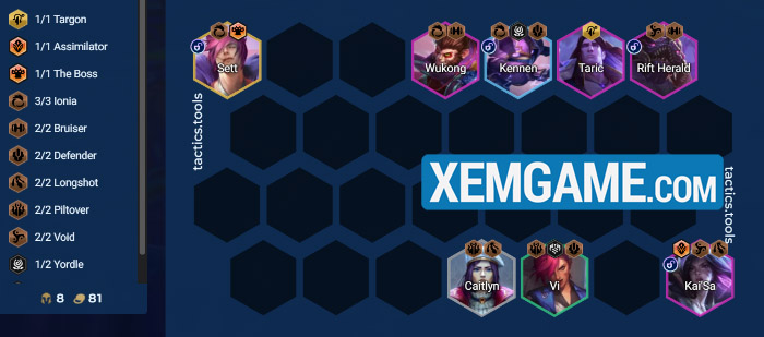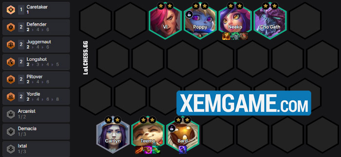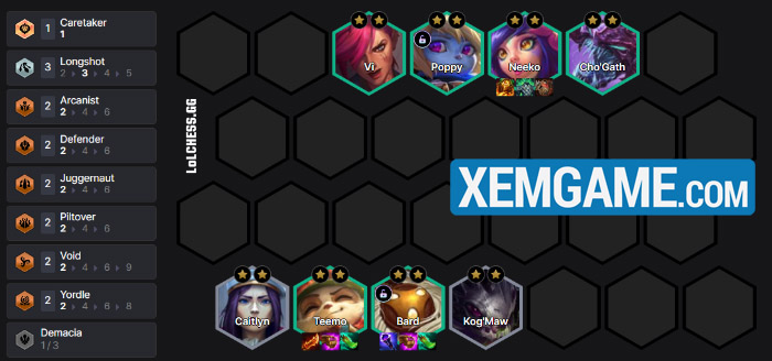 Cấp 8 thì bổ sung Kog’Maw thì chúng ta đã có 3 Tộc/Hệ vùng đất, tiếp tục up 9 và thêm Targon từ Taric là đủ :