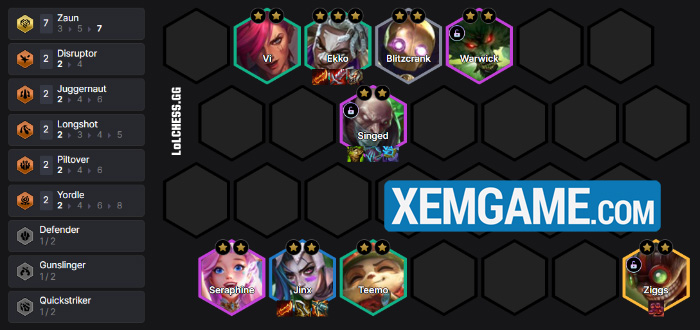 Về trang bị thì chúng ta sẽ cho Ekko các món đấu sĩ hút máu như dưới đây, trong khi đó Nidalee là các món AP, hồi máu còn biến thể Ziggs thì là các món tốc đánh, phép thuật . Cuối cùng là tank với các món chống chịu flex, các vị tướng khác lên theo hướng dẫn ingame.