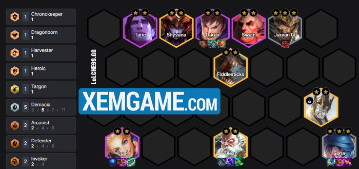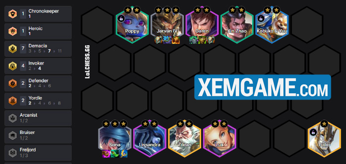 Ở giai đoạn cuối game, thì chúng ta sẽ hướng đến form 7 Demacia và 4 Thuật Sư để tối ưu hóa khả năng gây sát thương của Sona hoặc flex 5 vàng tùy ý để on top.