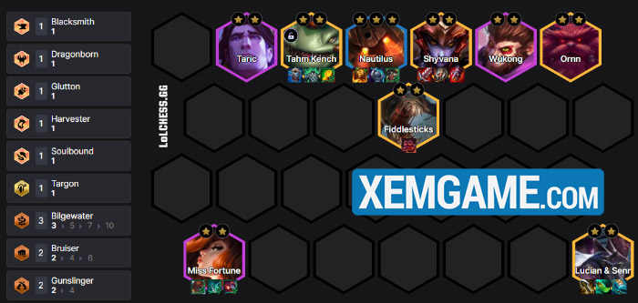 Về trang bị thì Miss Fortune và Nautilus, Tahm Kench sẽ xen kẽ giữa trang bị từ Chợ Đen và trang bị có thể ghép, chúng ta sẽ dư ra không ít đồ để flex cho các tướng 5 vàng còn lại. Một lưu ý là Nautilus 3 sao có thể mua từ Chợ Đen, nên hãy lấy các Lõi cho khả năng lên cấp nhanh hoặc vàng để roll được dàn tướng 5 vàng nặng ký ở trên.