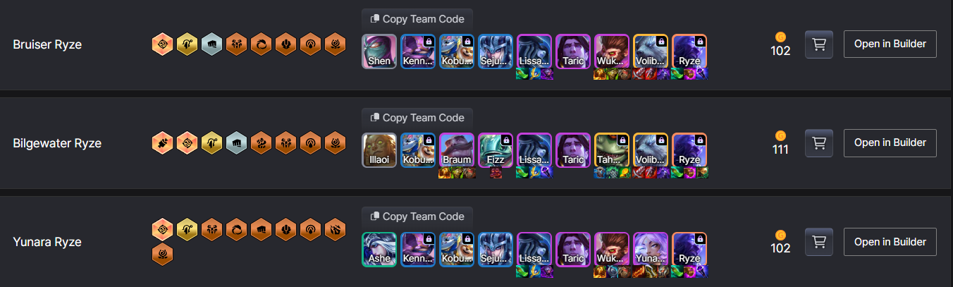 Tuy vậy, biến thể Ryze Ziggs ở đầu vẫn là form mạnh nhất với tỉ lệ thắng gần như tuyệt đối khi full nâng cấp tướng lên 2 sao nên chúng ta mới phải tách riêng chúng ra như thế. Trong trường hợp không thể dùng form Ryze Ziggs do bị tranh bài hay roll không ra tướng thì bạn vẫn có thể dùng một trong số các đội hình chỉ Ryze ở đây và vào top rất dễ dàng.