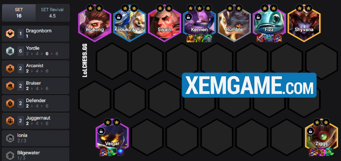 Tuy vậy chúng ta sẽ không đánh theo cách dát vàng tất cả Yordle thường thấy vì các Yordle vàng thấp rất tệ, thay vào đó chúng ta sẽ flex vào rất nhiều tướng 4-5 vàng bổ trợ mạnh như Shyvana, Swain, Wukong cho Veigar, Ziggs và phần nào đó cả Fizz xả sát thương :