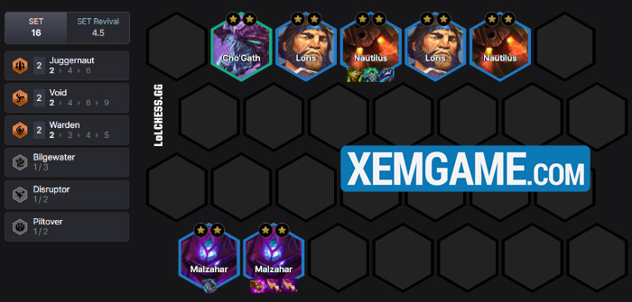 Nếu lấy được lõi Cặp Đôi Hoàn Cảnh, hãy chốt ngay đội hình Malzahar – Nautilus. Với các Tộc/Hệ chỉ cần mốc 2 và cộng thêm buff từ Cặp Đôi Hoàn Cảnh, Malzahar sẽ thăng tiến cực kỳ mạnh mẽ trong lúc dàn chắn 3 vàng phía trên sẽ hấp thu phần lớn sát thương của đối thủ.
