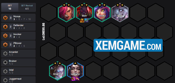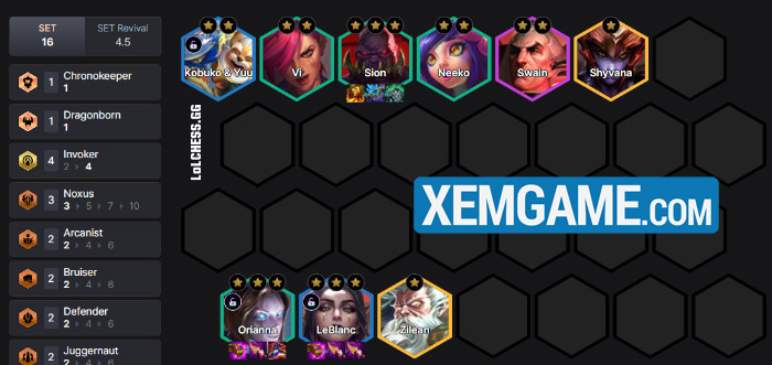 Up lên 7 và bắt đầu reroll, theo thứ tự Leblanc = Sion = Orianna. Sau khi có tầm 2 vị tướng 3 sao chúng ta sẽ mở khóa được Kobuko/Yuumi, up lên 8 bổ sung thêm Zilean/Shyvana là chúng ta đã có đội hình cực mạnh đánh late :