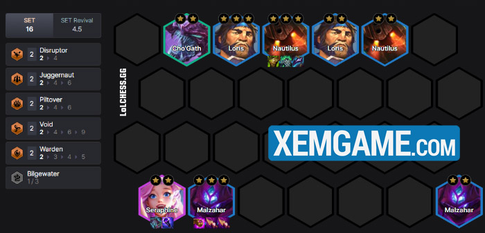 Một trong những đội hình mới nổi lên trong 16.3b chính là đội hình liên quan lõi Cặp Đôi Hoàn Cảnh, mà ở đây là bộ đôi 3 vàng Malzahar – Nautilus. Với các Tộc/Hệ chỉ cần mốc 2 và cộng thêm buff từ Cặp Đôi Hoàn Cảnh, Malzahar sẽ thăng tiến cực kỳ mạnh mẽ trong lúc dàn chắn 3 vàng phía trên sẽ hấp thu phần lớn sát thương của đối thủ.